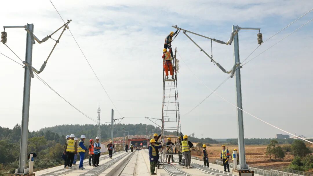 “掛網架線”指電氣化鐵路建設過程中,在鐵路線路上空架設供電線路,為電力機車提供動力,是高速鐵路施工過程中關鍵環節。此次架設的接觸網承力索是整個懸掛系統的核心構件,承擔著輸電與結構支撐的雙重作用,其架設質量直接關系到高鐵列車在運行中是否能持續穩定地接收電能。