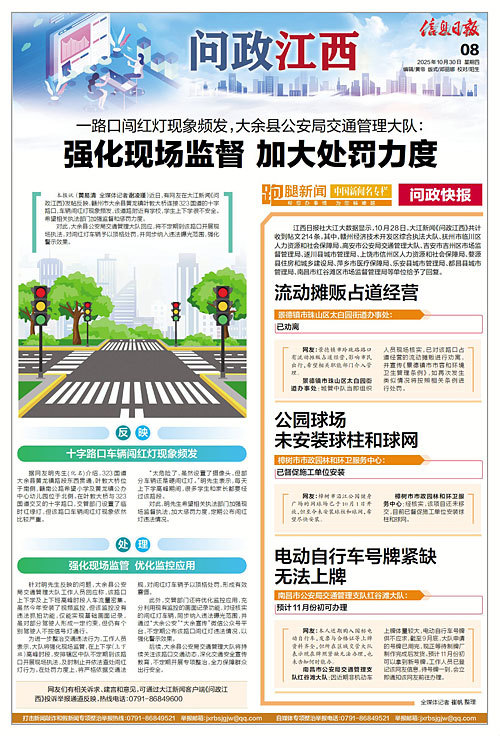 本報(bào)訊(黃易清全媒體記者謝凌瑾)近日,有網(wǎng)友在大江新聞《問(wèn)政江西》發(fā)帖反映,贛州市大余縣黃龍鎮(zhèn)葉敦大橋連接323國(guó)道的十字路口,車輛闖紅燈現(xiàn)象頻發(fā),該道路附近有學(xué)校,學(xué)生上下學(xué)很不安全。希望相關(guān)執(zhí)法部門加強(qiáng)監(jiān)督和懲罰力度。