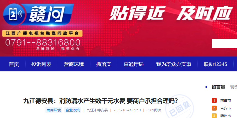 《贛問》平臺轉來的《九江德安縣:消防漏水產生數千元水費要商戶承擔合理嗎?》已收悉。